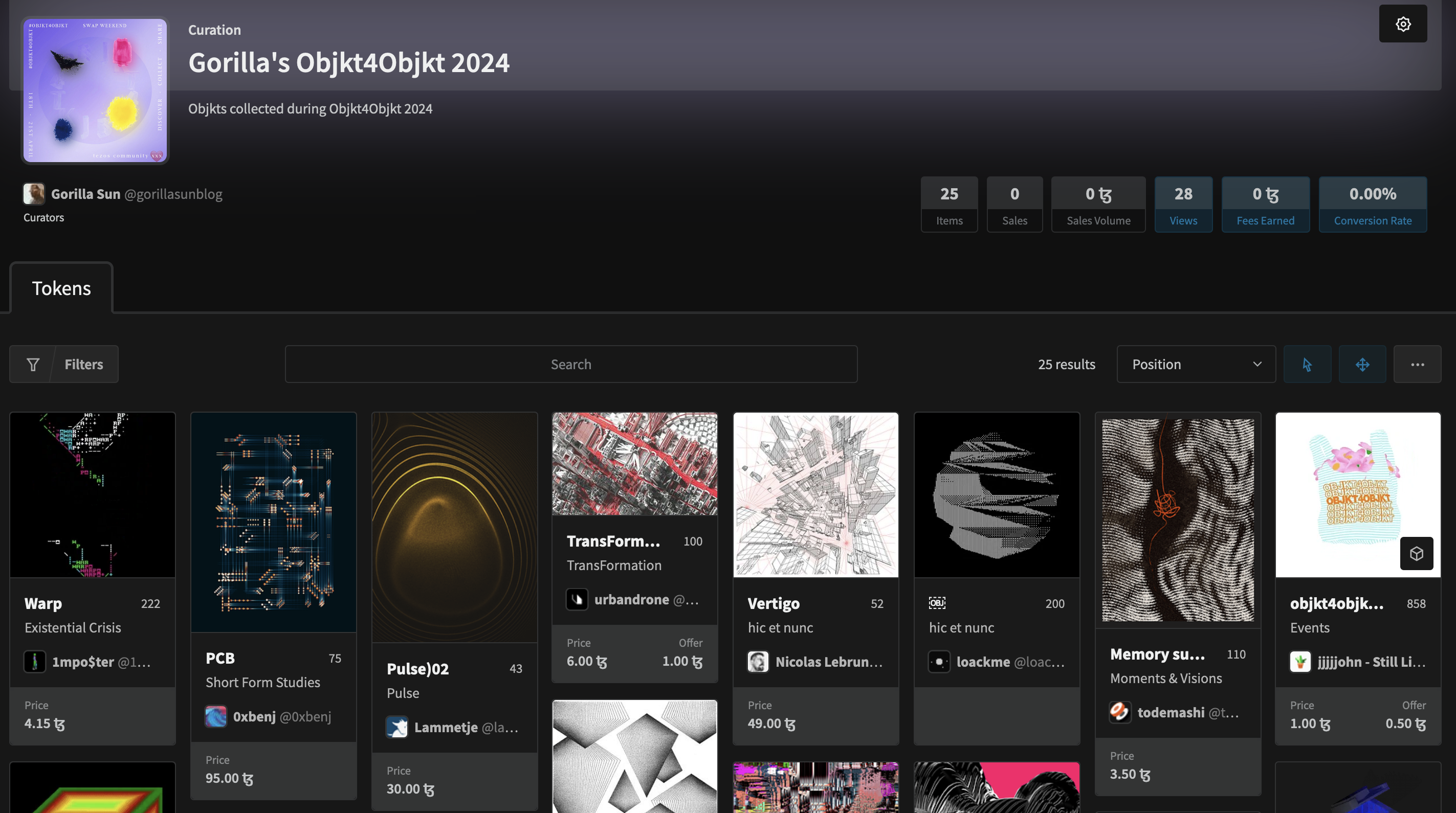 4. **Objkt Curations**: is a Tezos only marketplace that also offers a curation tool. It is not as advanced as the other two on this list, as it only lets you make sub-groupings of your collected pieces: