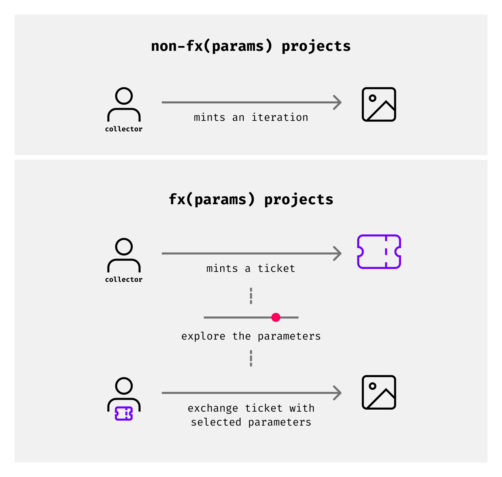 For this reason, a ticketing system is introduced. When you collect an edition of an fx(params) project, you obtain a mint ticket instead of having to immediately create the final output. This mint ticket can later be exchanged for your final GENTK after you’ve dialed in the parameters to your liking.
