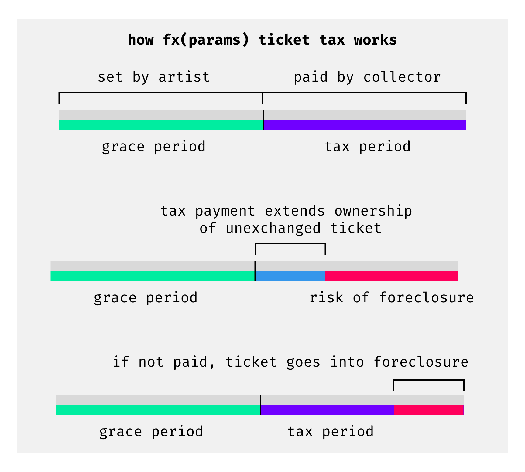 Grace periods can be as short as one day or longer than multiple lifetimes — it’s entirely up to the artist. When the grace period ends, the tax mechanism kicks in, requiring tickets to be listed on the market and subject to tax for as long as they remain unexchanged.